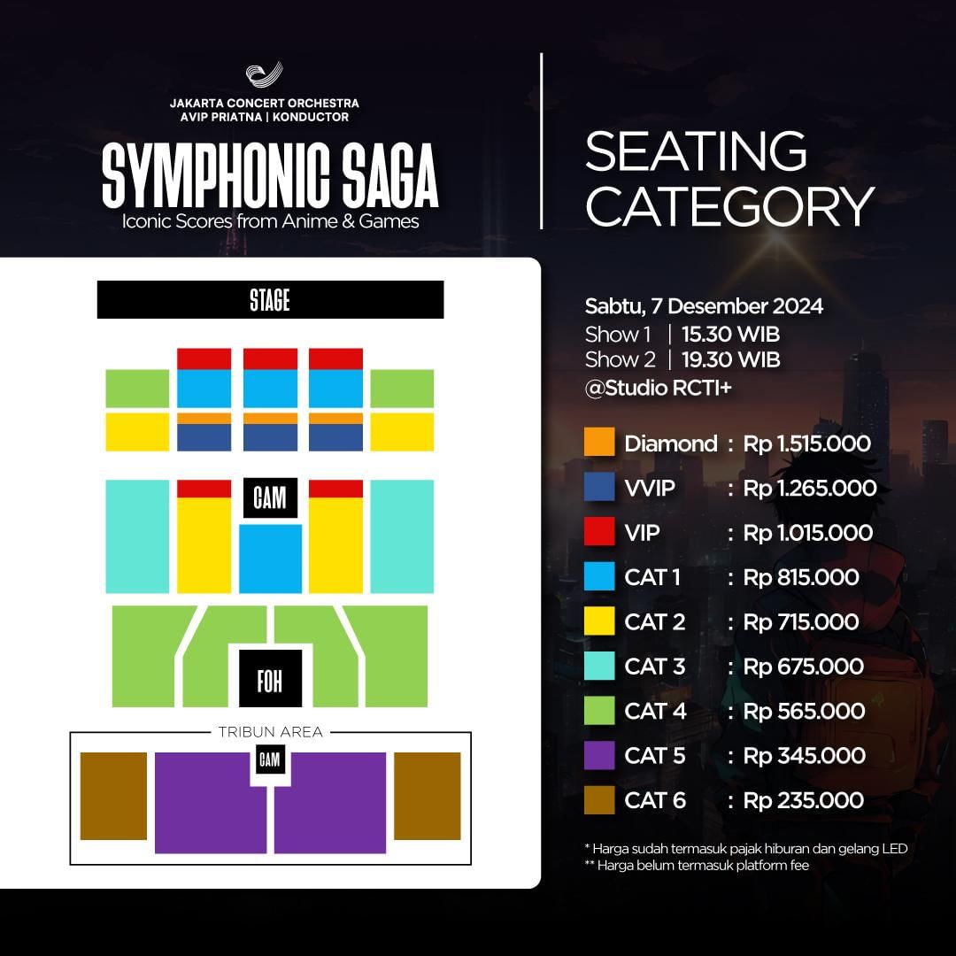 Seperti konser sebelumnya, Symphonic Saga akan diadakan dalam dua sesi, pukul 15.30 WIB dan 19.30 WIB. Selain konser, acara ini juga menyediakan booth makanan dan minuman, food truck, serta merchandise eksklusif bertema anime untuk pengunjung. Tiket dapat dibeli mulai hari ini, Kamis, 14 November 2024, pukul 09.00 WIB, dengan harga mulai dari Rp235.000 hingga Rp1.515.000. Semua penonton juga akan mendapatkan gelang LED warna-warni sebagai bagian dari pengalaman konser.