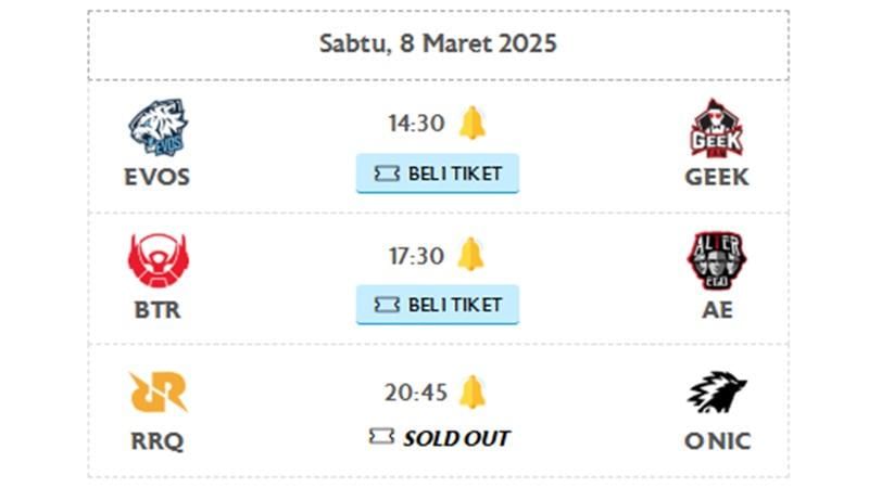 Antusiasme penggemar Mobile Legends mencapai puncaknya! Tiket pertandingan panas antara RRQ dan ONIC Esports resmi terjual habis dalam waktu singkat. Duel klasik ini selalu menjadi sorotan karena persaingan ketat dan strategi brilian dari kedua tim. Dengan atmosfer yang dipastikan akan membara di venue, para penggemar yang beruntung mendapatkan tiket siap menyaksikan pertarungan epik ini secara langsung.