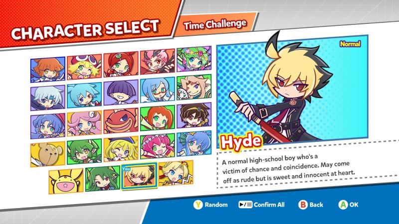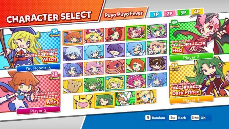 Terdapat 24 karakter yang dapat dimainkan, termasuk tokoh klasik seperti Arle Nadja dan Dark Prince serta karakter baru seperti Ally dari Puyo Puyo Chronicle.