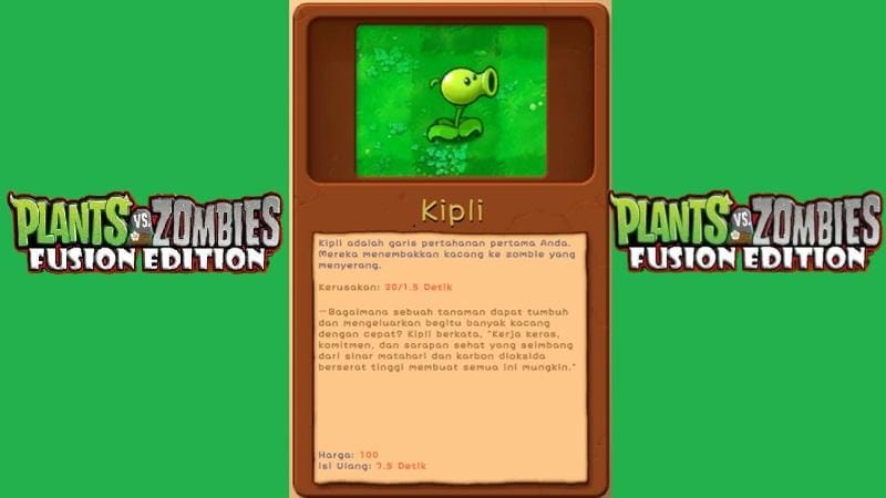 Kipli adalah plant pertama yang Kamu temui dalam permainan. Ia menembakkan kacang polong untuk menyerang zombie. Meski hanya menghasilkan satu serangan dalam satu waktu, Kipli sangat efisien untuk menghadapi zombie yang lemah di tahap awal permainan. Dengan kecepatan serangannya yang konsisten, Kipli adalah fondasi pertahanan Kamu dalam Plant vs Zombie Fusion.