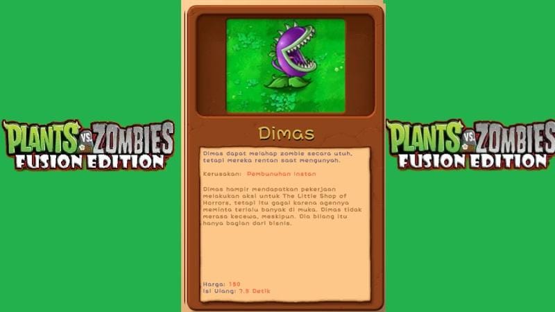 Dimas adalah plant yang kuat, karena ia bisa menelan zombie dalam satu gigitan. Namun, setelah melahap satu zombie, Dimas membutuhkan waktu untuk āmencernaā, sehingga Kamu harus menempatkannya di posisi yang strategis. Di versi fusion, Dimas dapat digabungkan dengan plant lain untuk mempercepat proses mencerna atau memberi kemampuan melahap lebih dari satu zombie sekaligus.